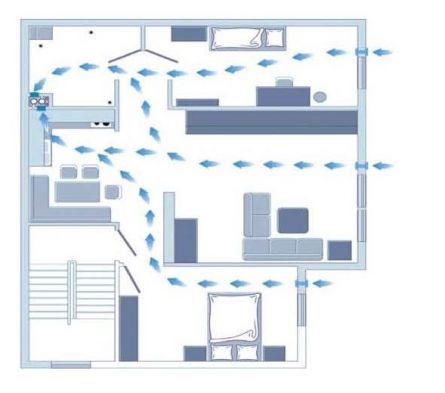 Бывают такие случаи когда необходимый приток воздуха настолько велик, что нужно ставить приточные клапаны практически под каждым окном в доме, а Вам этого делать не хочется, например, из эстетических соображений. Тогда Вам подойдет система принудительного притока воздуха.