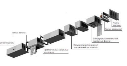 Приточная система состоит из вентиляционного оборудования и вентиляционной сети. К оборудованию относятся: воздушный клапан, фильтр, калорифер, вентилятор и шумоглушитель. А к сети можно отнести воздухозаборную решетку, воздуховоды и воздухораспределительные устройства (решетки, диффузоры, анемостаты). Набор оборудования приточной вентиляции представлен на рисунке ниже. Фильтр в системе приточной вентиляции необходим для очистки от крупных частичек пыли, которые присутствуют в уличном воздухе. Калорифер – для подогрева воздуха в холодный период года, они есть не во всех системах, устанавливаются по желанию заказчика и могут быть водяными и электрическими. При использовании водяных калориферов, систему вентиляции необходимо дополнительно оснащать смесительными узлами (гидравлическая обвязка калорифера), что в свою очередь удорожает систему.